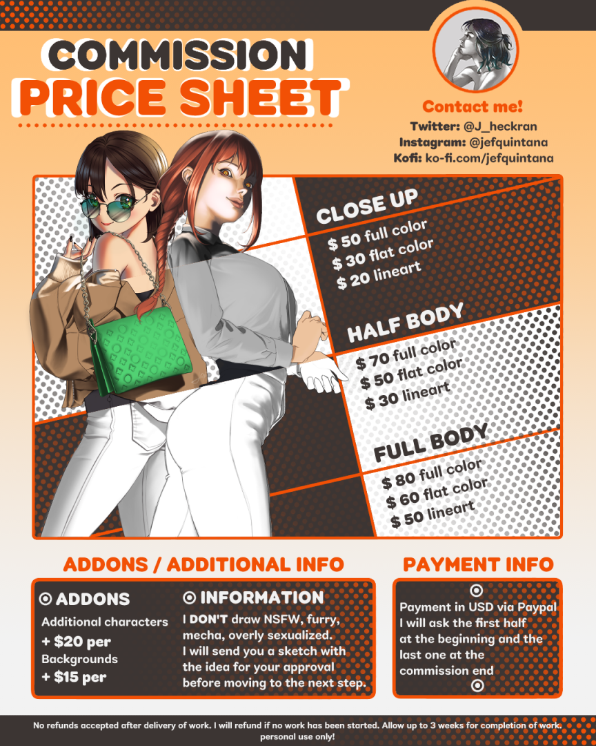 3. How much is the commercial fee?For commercial use: $30 USD + price of the commission you want.